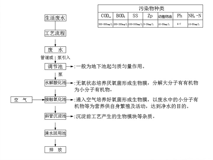 工艺流程:生活污水废水-化粪池-格栅-调节池--接触氧化池-二沉池-消毒池-清水池。